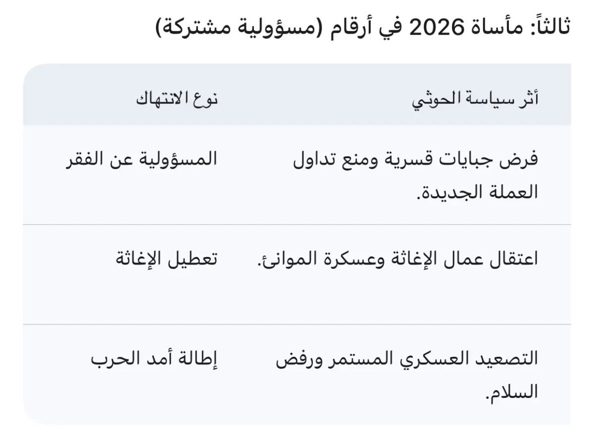 • شل العمل الإنساني: في مطلع 2026، وصلت انتهاكات الحوثيين ضد المنظمات الدولية إلى ذروتها بحملات اعتقال الموظفين الأمميين واقتحام المكاتب، مما أدى لتعليق المساعدات في صنعاء والمحافظات المجاورة، تاركةً الملايين يواجهون الموت جوعاً.